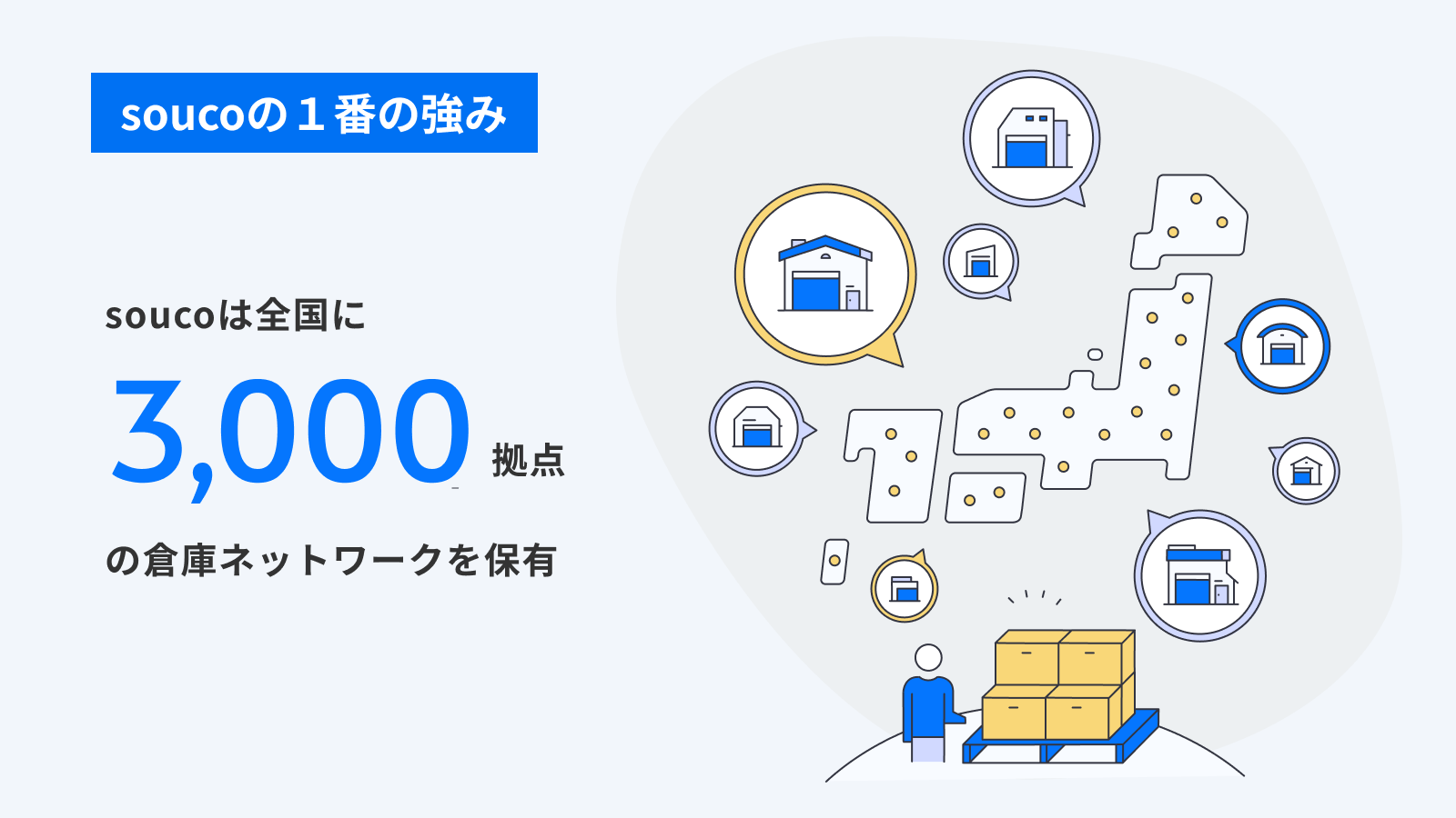 soucoは、全国47都道府県に3,000拠点以上の倉庫ネットワークを保有しています(2025年時点)。